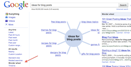 Here’s how Steven explains it: “The Google Wonder Wheel is an amazing tool which can spin ideas out of nothing. You can find the Wonder Wheel on the search at google.com, when you search on something there is a + box with ‘Show Options’ on it, you will find the Wonder Wheel on the list on the left hand side. Type in a phrase of your subject and Google Wheel will come up with similar phrases about your subject.”