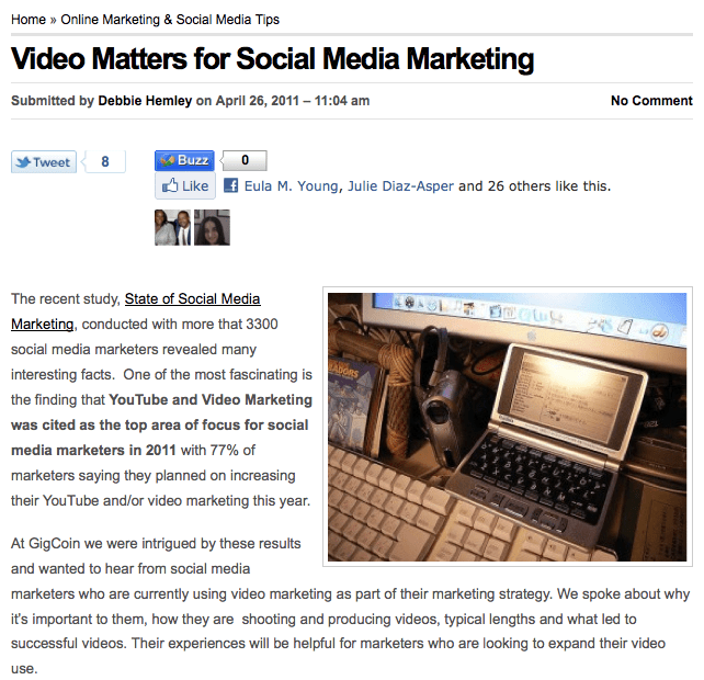Over the past several weeks I’ve written a few new posts on GigCoin’s blog about how video matters for social media marketing, the use of social buttons on websites and which sites work best for SEO.