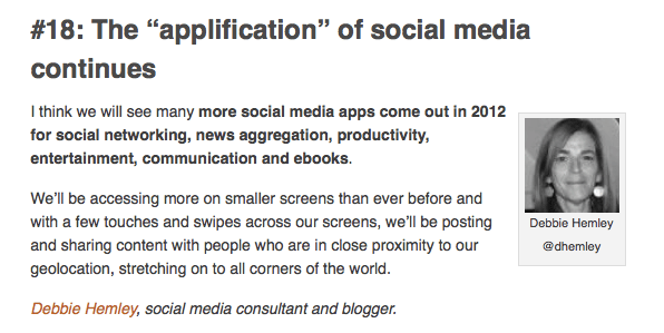I’m thrilled to be part of the writing community at Social Media Examiner and to have my social media prediction profiled there today as part of the “30 Social Media Predictions for 2012 from the Pros” post.