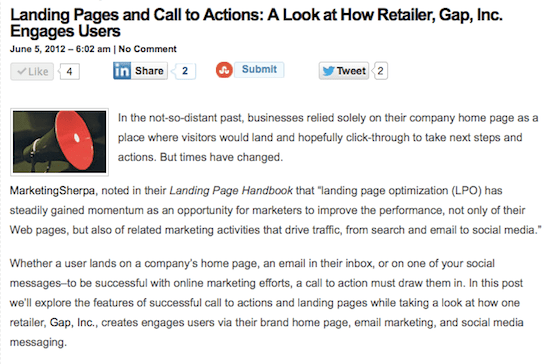 In this week’s post on GigCoin’s blog, my new post “Landing Pages and Call to Actions: A Look at How Retailer, Gap, Inc. Engages Users” deals with these questions while taking a look at how Gap has created landing pages that capture attention and entice people to click.
